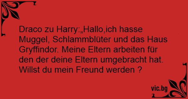 Draco zu Harry:„Hallo,ich hasse Muggel, Schlammblüter und das Haus Gryffindor. Meine Eltern arbeiten für den der deine Eltern umgebracht hat. Willst du mein Freund werden ?