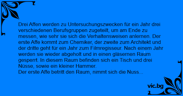 Der erste Affe betritt den Raum, nimmt sich die Nuss und riecht daran, hält sie gegen das Licht und analysiert die Oberfläche. Alle Forscher wissen - der Affe war ein Jahr beim Chemiker.