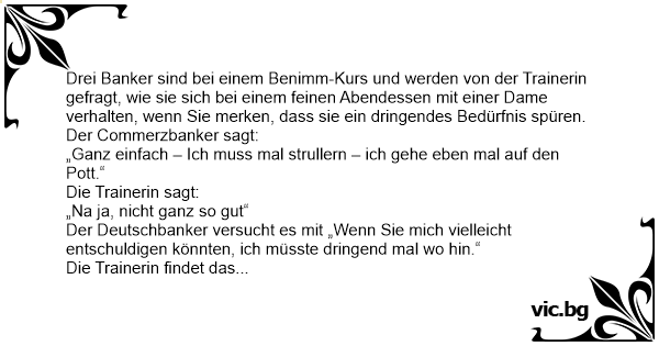 Dozent macht Benimmunterricht mit drei Bankern. Er fragt den ersten: "Sie haben eine charmante junge Dame zum Essen in ein Restaurant eingeladen und muessen mal auf die Toilette. Was sagen Sie?" Antwortet der erste von der Sparkasse: "Was soll ich da schon gross sagen? Ich sag halt: 'Also,...