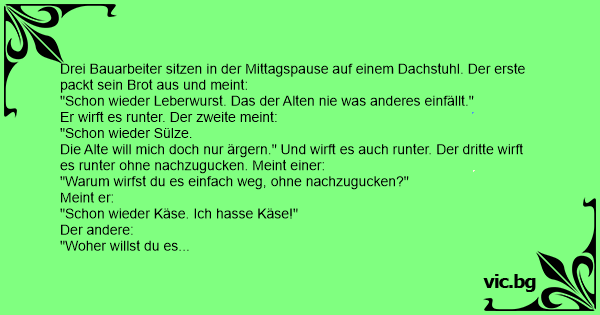 Drei Bauarbeiter sitzen in der Mittagspause auf einem Dachstuhl. Der erste packt sein Brot aus und meint: