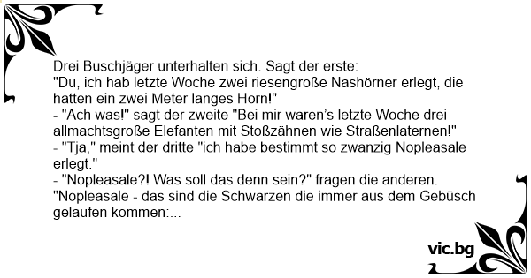 - "Tja," meint der dritte "ich habe bestimmt so zwanzig Nopleasale erlegt."