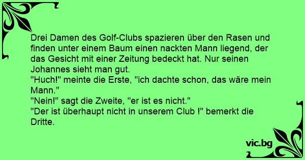 Drei Damen des Golf-Clubs spazieren über den Rasen und finden unter einem Baum einen nackten Mann liegend, der das Gesicht mit einer Zeitung bedeckt hat. Nur seinen Johannes sieht man gut.