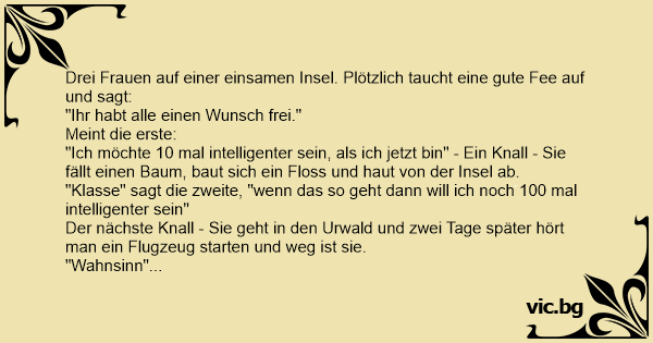 Drei Frauen auf einer einsamen Insel. Plötzlich taucht eine gute Fee auf und sagt: