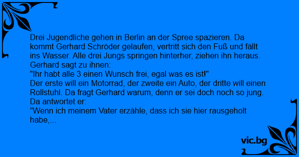 Drei Jugendliche gehen in Berlin an der Spree spazieren. Da kommt Gerhard Schröder gelaufen, vertritt sich den Fuß und fällt ins Wasser. Alle drei Jungs springen hinterher, ziehen ihn heraus. Gerhard sagt zu ihnen: