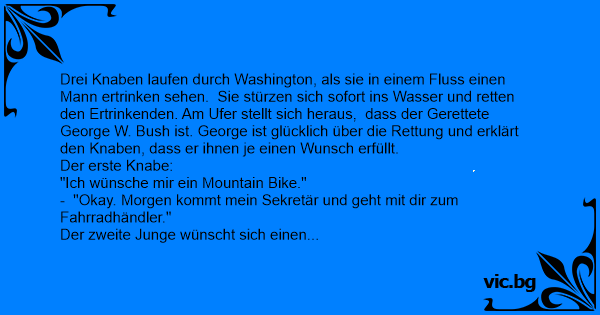 Drei Knaben laufen durch Washington, als sie in einem Fluss einen Mann ertrinken sehen. Sie stürzen sich sofort ins Wasser und retten den Ertrinkenden. Am Ufer stellt sich heraus, dass der Gerettete George W. Bush ist. George ist glücklich über die Rettung und erklärt den Knaben, dass er ihnen je einen Wunsch erfüllt.