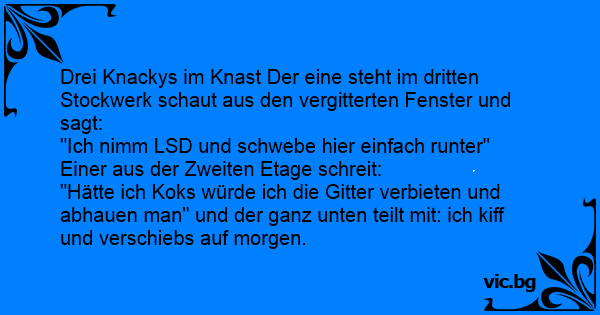 Drei Knackys im Knast Der eine steht im dritten Stockwerk schaut aus den vergitterten Fenster und sagt: