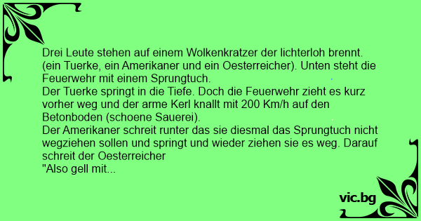 Drei Leute stehen auf einem Wolkenkratzer der lichterloh brennt. (ein Tuerke, ein Amerikaner und ein Oesterreicher). Unten steht die Feuerwehr mit einem Sprungtuch.