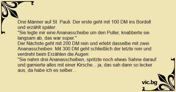 Drei Männer auf St. Pauli. Der erste geht mit 100 DM ins Bordell und erzählt später: