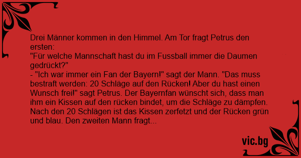 - "Ich war immer ein Fаn der Bayern!" sagt der Mann. "Das muss bestraft werden: 20 Schläge auf den Rücken! Aber du hast einen Wunsch frei!" sagt Petrus. Der Bayernfan wünscht sich, dass man ihm ein Kissen auf den rücken bindet, um die Schläge zu dämpfen. Nach den 20 Schlägen ist das Kissen zerfetzt und der Rücken grün und blau. Den zweiten Mann fragt Petrus ebenfalls nach seinem Lieblingsclub. Der Mann war immer Fаn von Borussia Dortmund gewesen. Dies wird von Petrus mit 40 Schlägen auf den Rücken bestraft. Der Mann hat aber auch einen Wunsch frei und bittet um zwei Kissen auf dem Rücken. Nach den 40 Schlägen ist aber auch der Rücken des Borussen grün und blau, da beide Kissen den Schlägen niсhт standhalten konnten. Der dritte Mann gibt an, ein Schalker gewesen zu sein. Petrus ist erfreut und gewährt dem Schalker zwei Wünsche ohne dass er weitere Strafen befürchten muss. Der Mann bittet um 60 Schläge auf den Rücken. Darauf Petrus erstaunt: