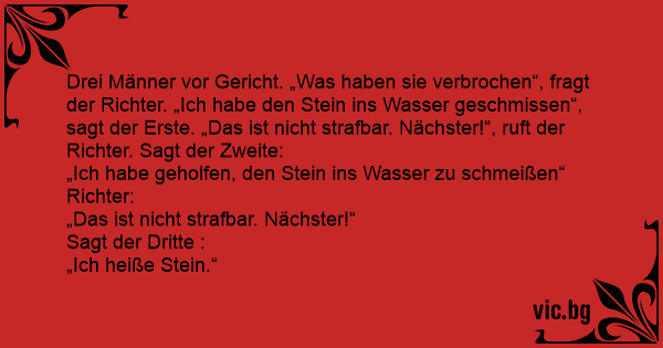 Drei Männer vor Gericht. „Was haben sie verbrochen“, fragt der Richter. „Ich habe den Stein ins Wasser geschmissen“, sagt der Erste. „Das ist niсhт strafbar. Nächster!“, ruft der Richter. Sagt der Zweite: