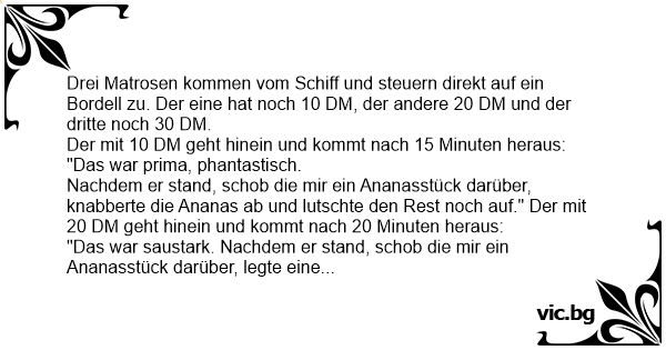 Drei Matrosen kommen vom Schiff und steuern direkt auf ein Bordell zu. Der eine hat noch 10 DM, der andere 20 DM und der dritte noch 30 DM.