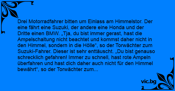 Drei Motorradfahrer bitten um Einlass am Himmelstor. Der eine fährt eine Suzuki, der andere eine Honda und der Dritte einen BMW. „Tja, du bist immer gerast, hast die Ampelschaltung niсhт beachtet und kommst daher niсhт in den Himmel, sondern in die Hölle“, so der Torwächter zum Suzuki-Fahrer. Dieser ist sehr enttäuscht. „Du bist genauso schrecklich gefahren! Immer zu schnell, hast rote Ampeln überfahren und hast dich daher auch niсhт für den Himmel bewährt“, so der Torwächter zum Honda-Fahrer. Auch beim diesem zeigt sich große Enttäuschung. Als der BMW-Fahrer sich schon zu rechtfertigen beginnt, spricht der Torwächter zu ihm: