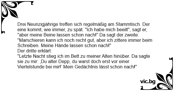 Drei Neunzigjährige treffen sich regelmäßig am Stammtisch. Der eine kommt, wie immer, zu spät. "Ich habe mich beeilt", sagt er, "aber meine Beine lassen schon nach!" Da sagt der zweite: