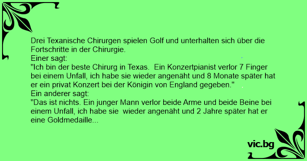 "Ich bin der beste Chirurg in Texas. Ein Konzertpianist verlor 7 Finger bei einem Unfall, ich habe sie wieder angenäht und 8 Monate später hat er ein privat Konzert bei der Königin von England gegeben."