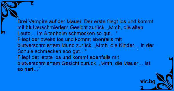 The Bat Bet Chiste del vampiro con sangre en la cara El chiste de los vampiros Drei Vampire haben Hunger Tre vampyrer bodde utanför en liten by. En natt kom den ena hem med med blod runt munnen. De andra frågade vad han hade gjort. - Ser ni huset där borta? Där var jag och sög blod. Nästa natt kom den andra vampyren hem med blodet rinnande nedför hakan.... Bir İngiliz vampir, bir Fransız vampir, bir de Temel vampir Uçakta gidiyorlarmış. Bir sure sonra İngiliz vampir aralarından ayrılmış, aşağılara dalmis. Bir sure sonra geri gelmiş ki, ağzı... Det var en gång tre vampyrer som skulle tävla om vem som kunde hitta mest blod att dricka. Vampyr nr 1 flög i väg och kom tillbaka med blodiga tänder: - Vart fick du det blodet ifrån? - Ser ni... Drakula hade skickat ut tre vampyrer för att se vem av dom som kunde samla ihop mest blod. Den första som kom tillbaka hade med sig två droppar blod. Han sa: - Ser ni bondgården där borta, där sög... Había 2 vampiros. Uno estaba bañado en sangre y el otro le pregunta: - ¿De dónde sacaste tanta sangre? - ¿Ves aquella pared de allí? - Sí. - ¡Pues yo no la vi!Vales Amazon en Rebajas.Guru Un vampiro llega a su casa con la boca llena de sangre, y su mamá le pregunta: - ¿Dónde conseguiste eso tan rico?. Y él responde: - ¿Ves ese muro que está allá? - Si - Bueno, pues yo no lo vi. Det var en gang tre vampyrer som skulle få tak i mest blod. Den første kom tilbake med blod på tennene og sa: – Ser dere det huset der, der fikk jeg tak i det blodet. Den andre kom tilbake med blod... Tre vampyrer vaknade och var jättetörstiga på blod. Den ena flög blixtsnabbt iväg och kom tillbaka efter 10 minuter med hela ansiktet fullt med blod. – Var har du varit? – Ser ni den där bondgården... Un vampiro llega con toda la boca rebosante de sangre a donde estaba otro, y éste le dice: - Oye viejo, dime, ¿Dónde conseguiste toda esa rica sangre? El otro le respondió: - Bueno, ¿Ves ese muro... Erau odata trei vampiri carora le era foame. Se duce primu' si se intoarce cu gura plina de sange..... Ceilalti il intreaba: - Ba, de unde ai luat sange? - Vedeti turma aia de oi? - Da! - Am... O pai vampiro estava ensinando seus filhos vampiros a chupar sangue: O primeiro vem a ele com a boca cheia de sangue e diz: — Pai você esta vendo aquela vaca ali? Chupei todo o sangue dela! O... Den äldsta av de tre vampyrbröderna kom hem en natt med ett leende kantat av blod. - Åh! utbrast hans bröder, var har du varit? - Ser ni ljuset från staden där borta? Där har jag varit i natt och... Två vampyrer var ute och letade efter mat, och efter en stund bestämde de sig för att skiljas åt och träffas senare. När de möttes igen hade ena vampyren munnen full med blod, så den andra vampyren... Hay dos vampiros y unos le dice al otro: -¿ De dónde has sacado esa sangre? -¿ Ves esa pared? - Sí. - Pues yo no la ví Sitzen drei Vampire kurz nach Mitternacht auf der Mauer. Sagt der erste: „Oh man, ich hab Hunger und brauch‘ Blut!“ Er fliegt los und kommt nach zehn Minuten wieder zurück – um den Mund voller...