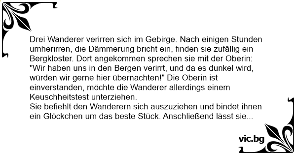 "Wir haben uns in den Bergen verirrt, und da es dunkel wird, würden wir gerne hier übernachten!" Die Oberin ist einverstanden, möchte die Wanderer allerdings einem Keuschheitstest unterziehen.