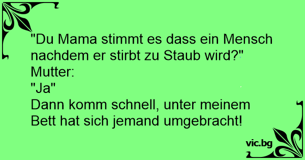 Das kleine Fritzchen fragt seine Mutter: "Was passiert mit uns, wenn wir sterben?" Die Mutter antwortet: "Dann werden wir zu Staub." Darauf der Bub: "Puh, dann müssen schon viele Menschen unter meinen Bett gestorben sein!"
