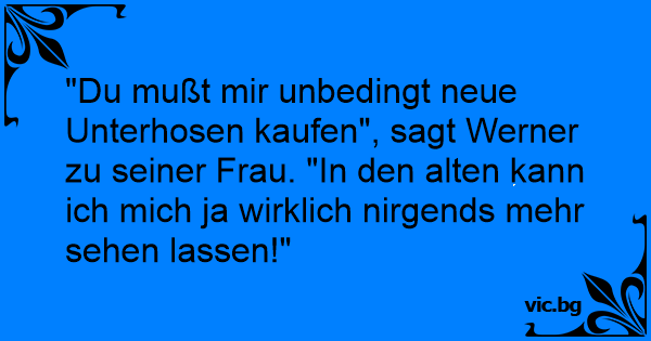 "Du mußt mir unbedingt neue Unterhosen kaufen", sagt Werner zu seiner Frau. "In den alten kann ich mich ja wirklich nirgends mehr sehen lassen!"