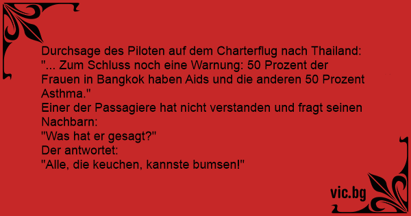 Съобщение на пилота на чартърния полет за Тайланд: „... И накрая едно предупреждение: 50 процента от жените в Банкок са болни от СПИН, а останалите 50 процента имат астма.“ Един от пътниците не...