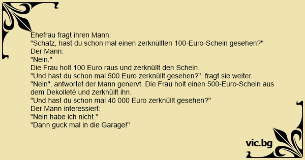Със съблазнителен глас, жената пита мъжа си: - Виждал ли си някога 20 € са смачкани? - Не. Тя му се усмихва секси, разкопчава първите 3 копчета на блузата си бавно, показвайки циците си, сваля прекрасен малък сутиен и го хвърля на леглото. Съпругът взема сутиена и се усмихва одобрително. - А...