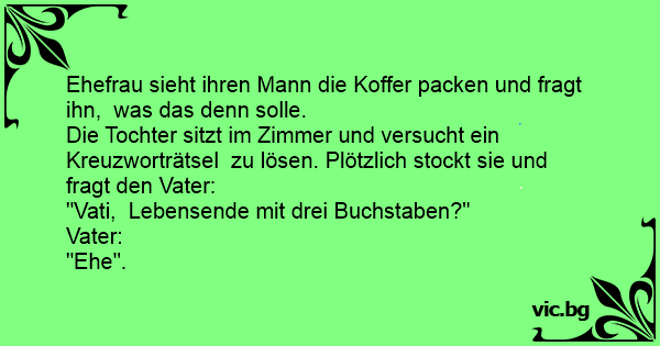 Ehefrau sieht ihren Mann die Koffer packen und fragt ihn, was das denn solle.