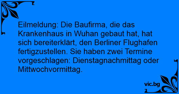 Eilmeldung: Die Baufirma, die das Krankenhaus in Wuhan gebaut hat, hat sich bereiterklärt, den Berliner Flughafen fertigzustellen. Sie haben zwei Termine vorgeschlagen: Dienstagnachmittag oder Mittwochvormittag.