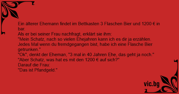 "Mein Schatz, nach so vielen Ehejahren kann ich es dir ja erzählen. Jedes Mal wenn du fremdgegangen bist, habe ich eine Flasche Bier getrunken."