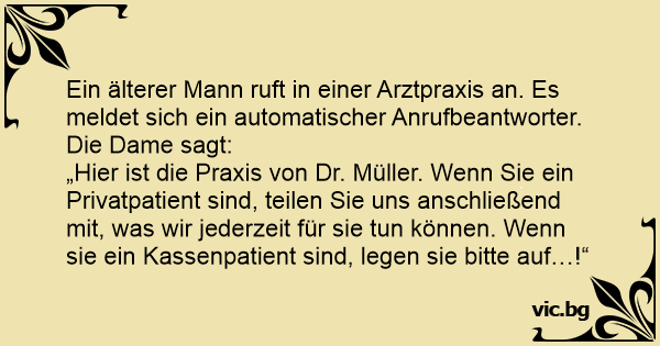 „Hier ist die Praxis von Dr. Müller. Wenn Sie ein Privatpatient sind, teilen Sie uns anschließend mit, was wir jederzeit für sie tun können. Wenn sie ein Kassenpatient sind, legen sie bitte auf…!“