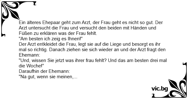 Der Arzt entkleidet die Frau, legt sie auf die Liege und besorgt es ihr mal so richtig. Danach ziehen sie sich wieder an und der Arzt fragt den Ehemann: