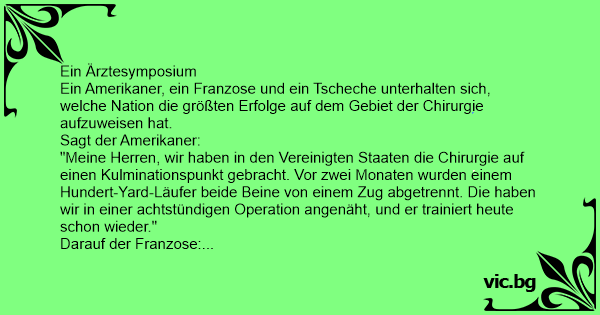 Ein Amerikaner, ein Franzose und ein Tscheche unterhalten sich, welche Nation die größten Erfolge auf dem Gebiet der Chirurgie aufzuweisen hat.