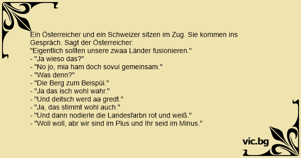 Ein Österreicher und ein Schweizer sitzen im Zug. Sie kommen ins Gespräch. Sagt der Österreicher: