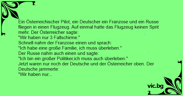 Bush,Haider,der Papst und ein Junge sitzen im Flieger. Plötzlich kommen Turbolenzen auf. Da sagt der Pilot: " Wir stürzen ab! Bitte alle denn Flieger verlassen!" OK es sind 3 Fallschirme aber 4 Personen. Da sagt Bush: " Ich bin der wichtigste und gescheiterste Mann der Welt, ich nehm mir...