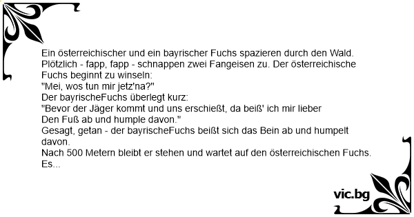 Ein österreichischer und ein bayrischer Fuchs spazieren durch den Wald. Plötzlich - fapp, fapp - schnappen zwei Fangeisen zu. Der österreichische Fuchs beginnt zu winseln: