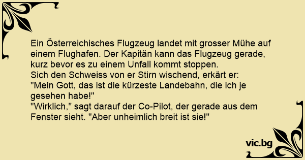 На международното летише Кенеди каца самолет на авиокомпания Балкан. Самолетът спира точно на трийсет сантиметра от края на пистата. В кабината единият пилот ядосано казва на другия: - Скиваш ли ги тия американци бе, Пешо. Нищо не им е като хората. Глей кви къси писти правят, а погледни колко е...