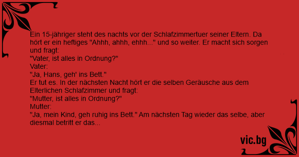 "Ja, mein Kind, geh ruhig ins Bett." Am nächsten Tag wieder das selbe, aber diesmal betritt er das Elternschlafzimmer und sieht, wie sich seine Eltern sexuell betätigen.