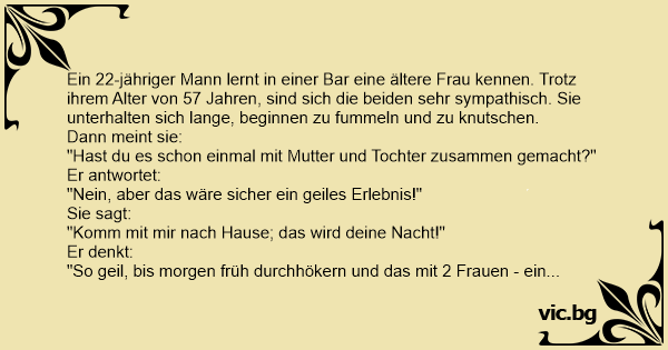 Un hombre conoce a una mujer atractiva de 58 años en un bar. Ellos beben un poco, charlan, luego ella le pregunta: - ¿Has tenido alguna vez el sexo con madre e hija al mismo tiempo? - No. - ¿Y te...