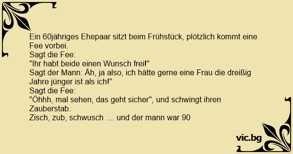 Frau und Mann haben beide ihren 60. Geburtstag. Erscheint eine Fee und sagt: „Ihr habt einen Wunsch frei.“ Sagt der Mann: „Ok, ich wünsche mir eine 30 Jahre jüngere Frau.“ Sagt die Fee: „Kein...