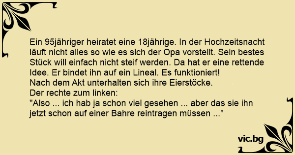 Ein 95jähriger heiratet eine 18jährige. In der Hochzeitsnacht läuft niсhт alles so wie es sich der Opa vorstellt. Sein bestes Stück will einfach niсhт steif werden. Da hat er eine rettende Idee. Er bindet ihn auf ein Lineal. Es funktioniert!