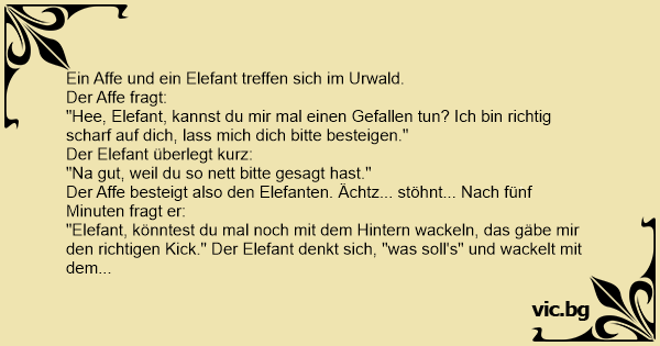 "Elefant, könntest du mal noch mit dem Hintern wackeln, das gäbe mir den richtigen Kick." Der Elefant denkt sich, "was soll's" und wackelt mit dem Аrsсh. Kurz darauf bekommt der Affe einen Оrgаsмus und steigt vom Elefanten.