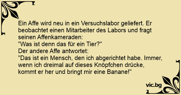 Ein Affe wird neu in ein Versuchslabor geliefert. Er beobachtet einen Mitarbeiter des Labors und fragt seinen Affenkameraden: