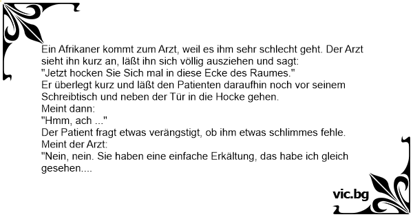 Ein Afrikaner kommt zum Arzt, weil es ihm sehr schlecht geht. Der Arzt sieht ihn kurz an, läßt ihn sich völlig ausziehen und sagt: