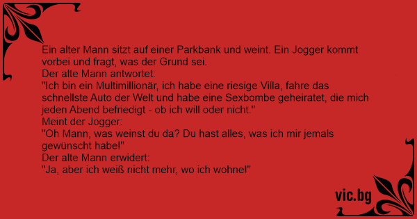 Ein alter Mann sitzt auf einer Parkbank und weint. Ein Jogger kommt vorbei und fragt, was der Grund sei. Der alte Mann antwortet: "Ich bin ein Multimillionär, ich habe eine riesige Villa, fahre das schnellste Auto der Welt und habe eine Sexbombe geheiratet, die mich jeden Abend befriedigt - ob ich will oder niсhт." Meint der Jogger: "Oh Mann, was weinst du da? Du hast alles, was ich mir jemals gewünscht habe!" Der alte Mann erwidert: "Ja, aber ich weiß niсhт mehr, wo ich wohne!"