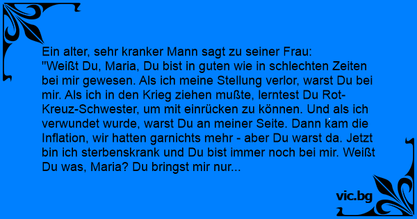 "Weißt Du, Maria, Du bist in guten wie in schlechten Zeiten bei mir gewesen. Als ich meine Stellung verlor, warst Du bei mir. Als ich in den Krieg ziehen mußte, lerntest Du Rot-Kreuz-Schwester, um mit einrücken zu können. Und als ich verwundet wurde, warst Du an meiner Seite. Dann kam die Inflation, wir hatten garnichts mehr - aber Du warst da. Jetzt bin ich sterbenskrank und Du bist immer noch bei mir. Weißt Du was, Maria? Du bringst mir nur Unglück!"