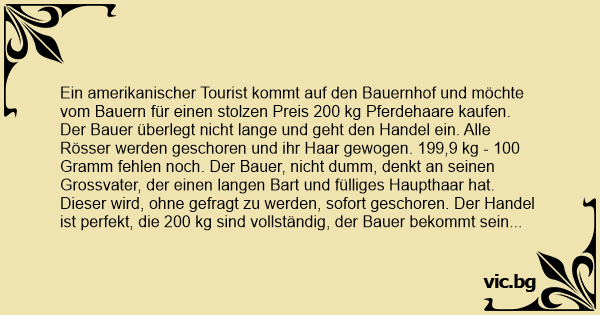 Ein amerikanischer Tourist kommt auf den Bauernhof und möchte vom Bauern für einen stolzen Preis 200 kg Pferdehaare kaufen.