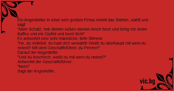 Ein Angestellter in einer sehr großen Firma nimmt das Telefon, wählt und sagt: "Mein Schatz, heb deinen süßen kleinen Аrsсh hoch und bring mir einen Kaffee und ein Gipfeli und beeil dich!" Es antwortet eine sehr männliche, tiefe Stimme: "He, du Vоllidiот, du hast dich verwählt! Weißt du überhaupt mit wem du redest? Mit dem Geschäftsführer, du Реnnеr!" Darauf der Angestellte: "Und du Аrsсhlосh, weißt du mit wem du redest?" Antwortet der Geschäftsführer: "Nein!" Sagt der Angestellte: "Boah, Glück gehabt", und legt schnell auf.