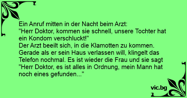 Mitten in der Nacht klingelt beim Arzt das Telefon: "Herr Doktor, kommen Sie schnell! Unsere Tochter hat ein Kondom verschluckt!" Der Arzt springt aus dem Bett, zieht sich an und eilt zur Haustür....