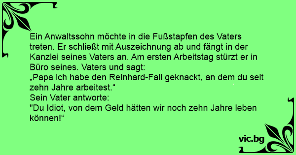 Ein junger Rechtsanwalt besucht seinem Vater, der auch Rechtsanwalt ist. Der Sohn berichtet stolz: "Stell dir vor Vater, den Erbschaftsprozess, den du mir übergeben hast, habe ich gewonnen." "Du...