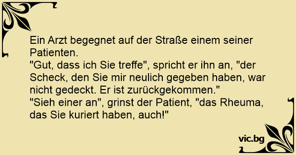 "Sieh einer an", grinst der Patient, "das Rheuma, das Sie kuriert haben, auch!"