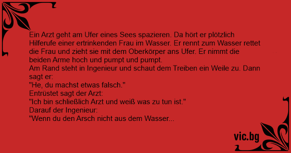 Ein Arzt geht am Ufer eines Sees spazieren. Da hört er plötzlich Hilferufe einer ertrinkenden Frau im Wasser. Er rennt zum Wasser rettet die Frau und zieht sie mit dem Oberkörper ans Ufer. Er nimmt die beiden Arme hoch und pumpt und pumpt.