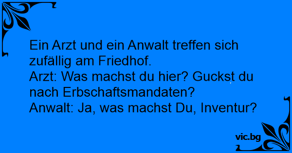 Ein Arzt und ein Anwalt treffen sich auf dem Friedhof. Der Arzt an den Anwalt gewandt: "Na, Suchen Sie neue Erbrechtsmandate?" Der Anwalt : "Und Sie, machen Sie Inventur?"